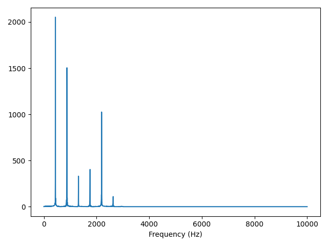 The fundamental frequency of this signal is near 440 Hz, the other spikes in the spectrum are at frequencies 880, 1320, 1760, and 2200, which are integer multiples of the fundamental. These components are called harmonics because they are musically harmonious with the fundamental: